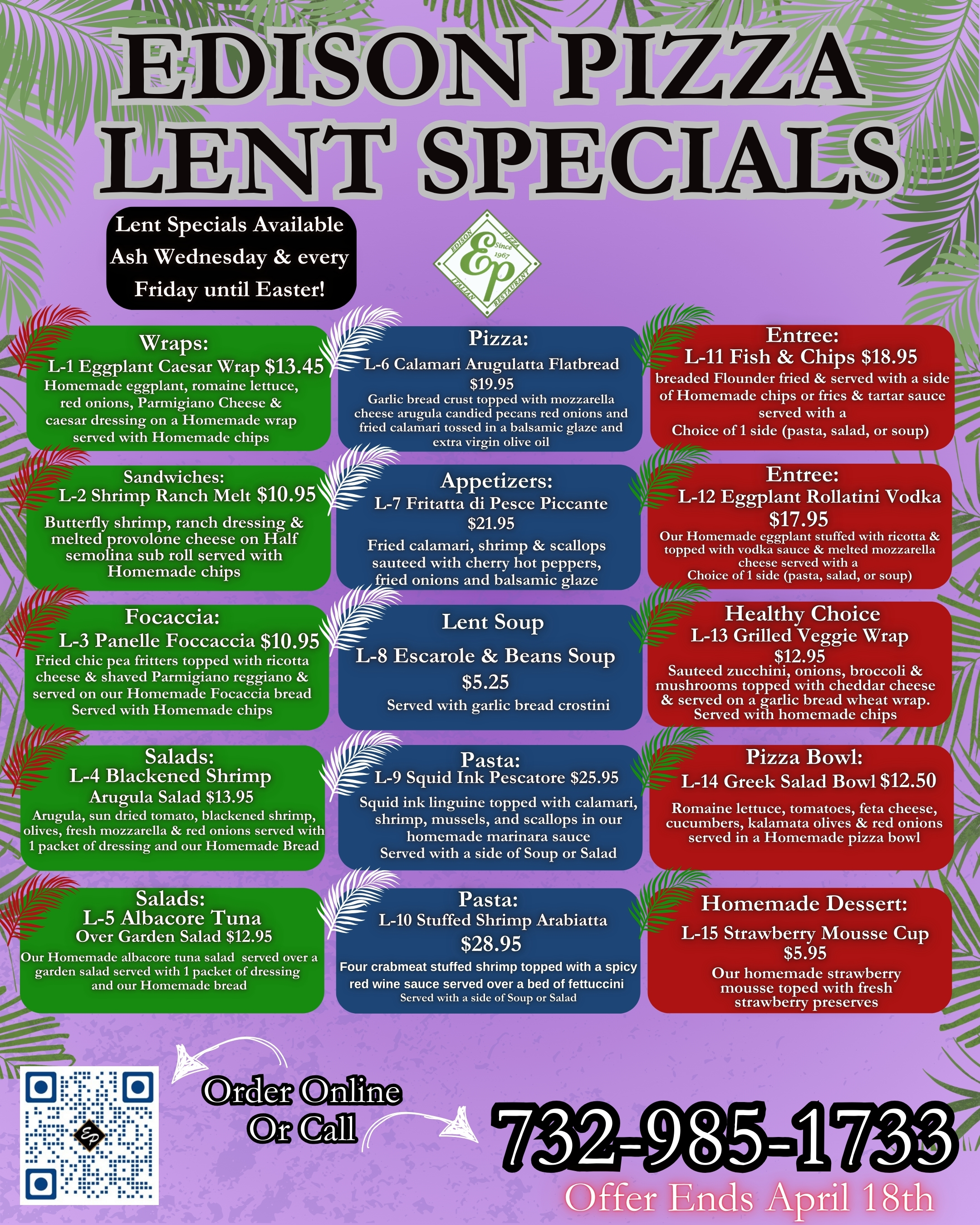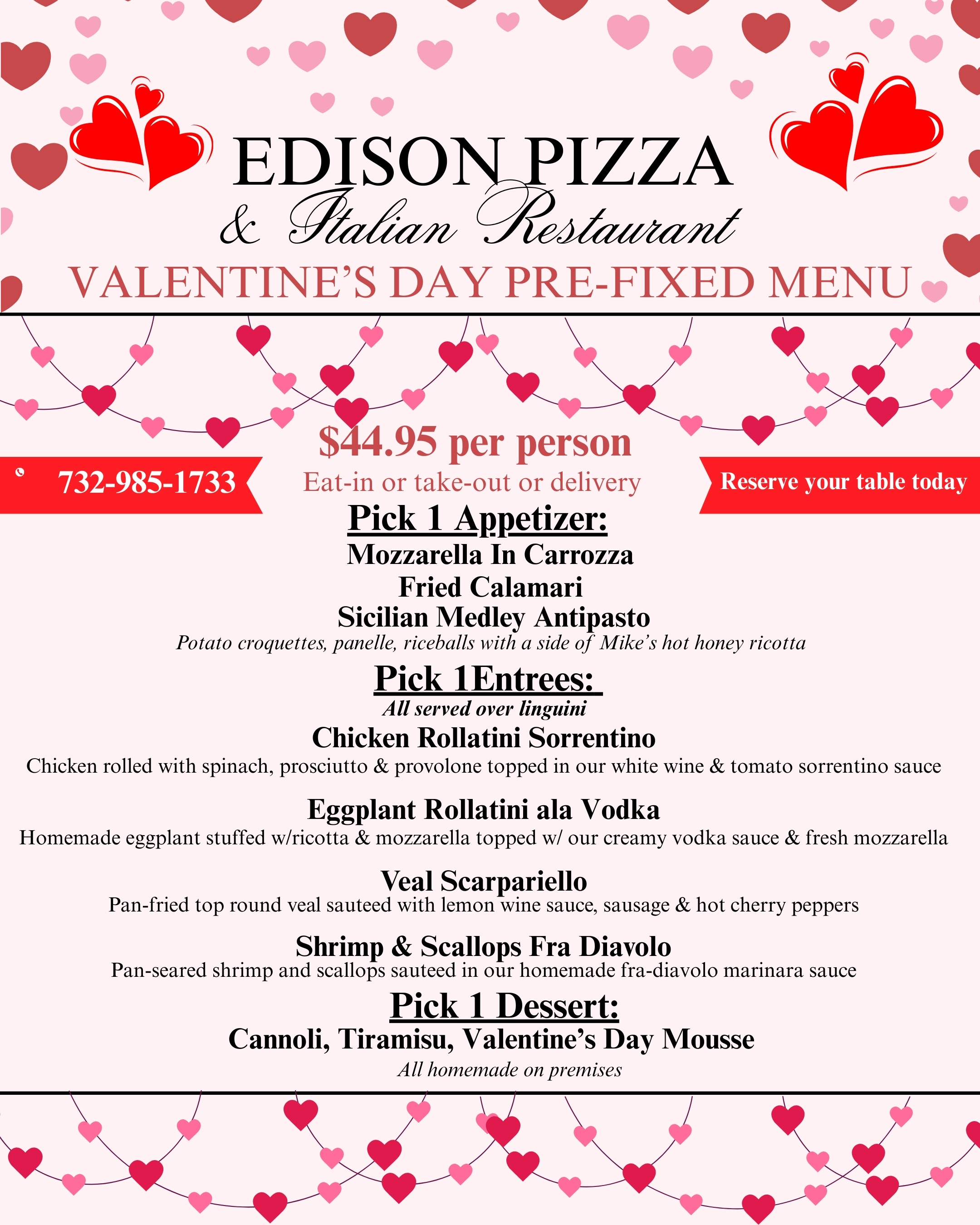 Looking for a casual meal with your family, the perfect place for a date night, fast hot delivery or Catering. Look no further than Edison Pizza & Italian Restaurant! We can accommodate parties of up to 20 on a nightly basis. or private parties of up to 60. Come in for our great daily specials & save room for our homemade desserts.